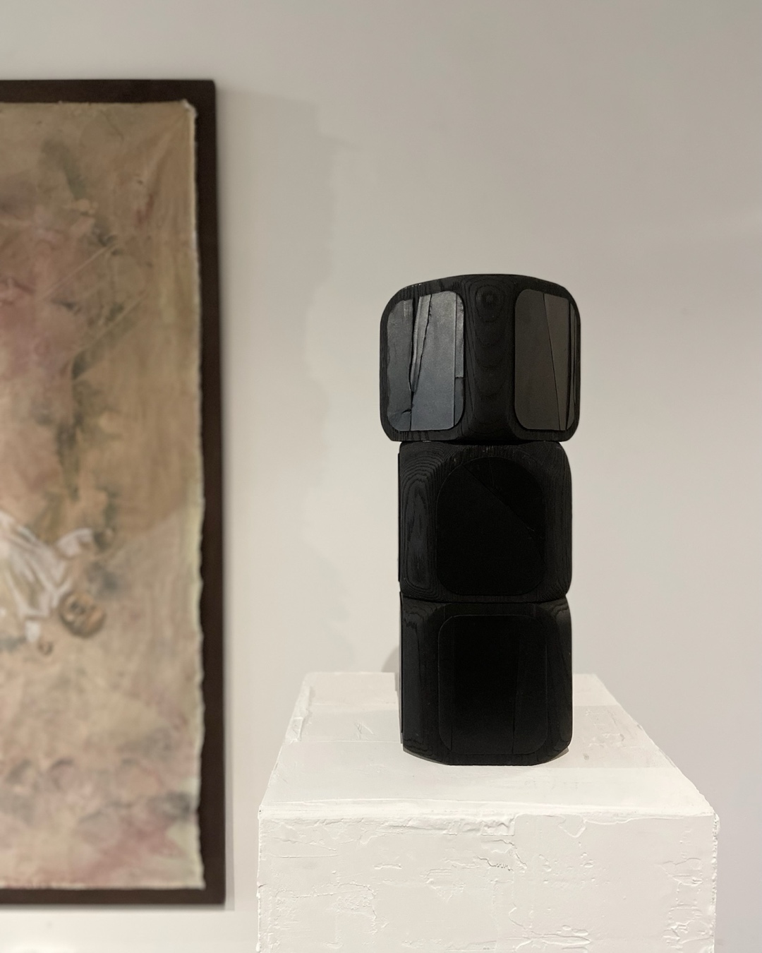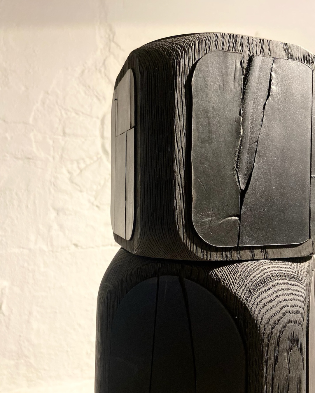 This sculpture brings together blackened solid wood and organic Italian leather, merging two natural materials through a process rooted in heritage and longevity. The wood is darkened using an ancient, fully natural technique practiced in Studio LINFIN. While the leather is composed of fragments, offcuts from the studio’s lifelong bags, reassembled with precision into a unified surface. What once existed as remnants becomes a new composition, a testament to transformation and continuity.