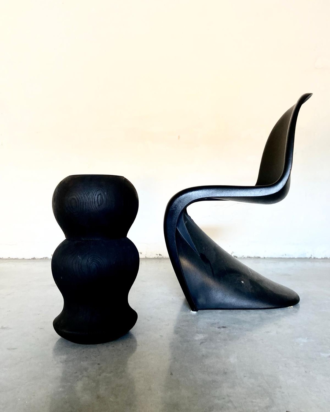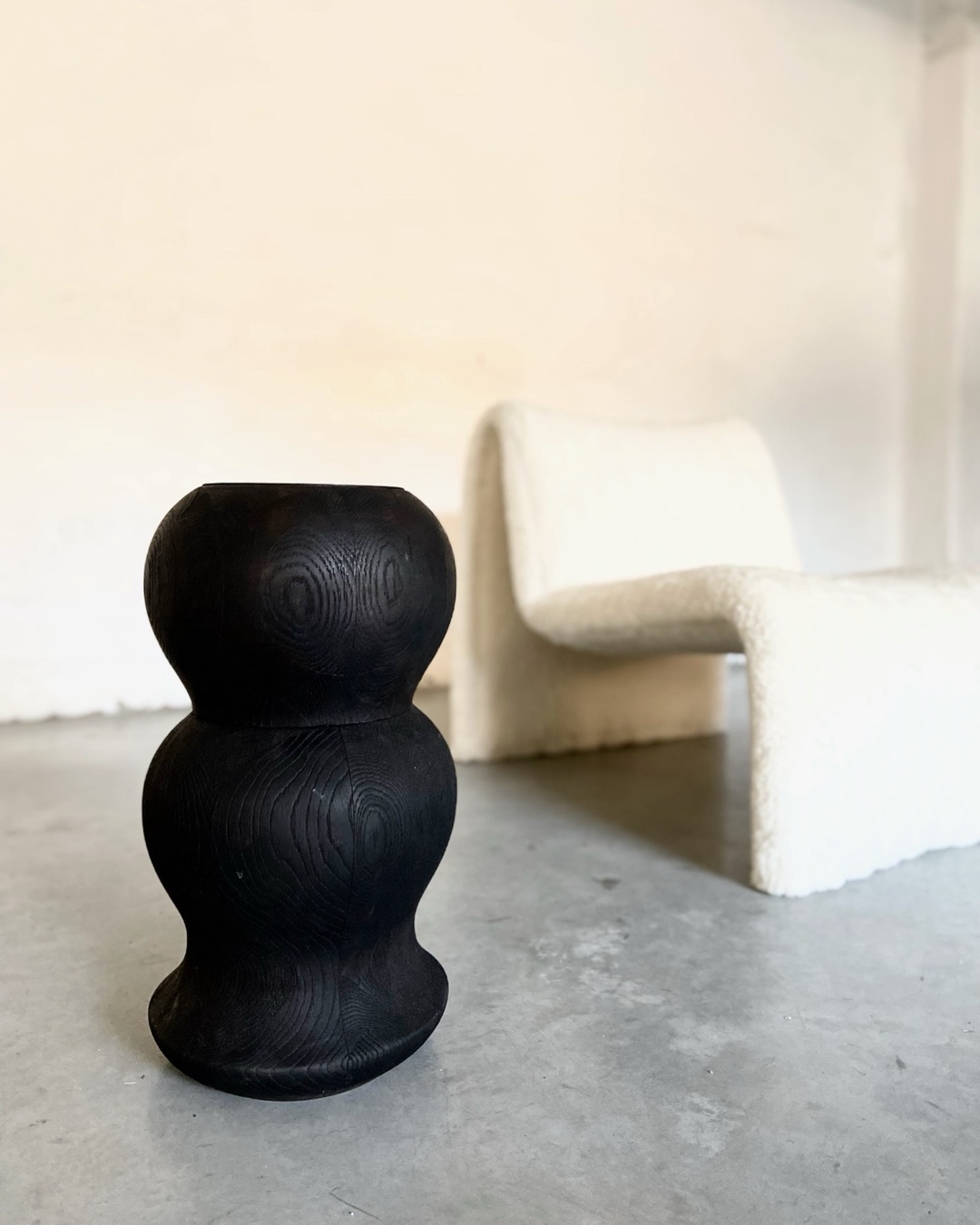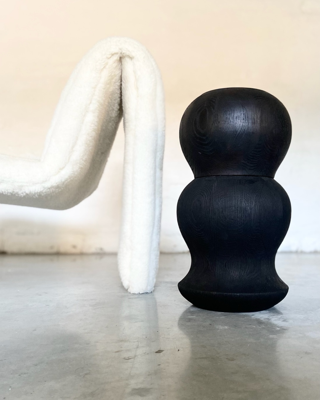 This sculpture brings together blackened solid wood and organic Italian leather, merging two natural materials through a process rooted in heritage and longevity, while its balanced geometry allows it to function effortlessly as a sculptural side table. The wood is darkened using an ancient, fully natural technique practiced in Studio LINFIN. The leather is composed of fragments, offcuts from the studio’s lifelong bags, reassembled with precision into a unified surface. What once existed as remnants becomes a new composition, a testament to transformation and continuity.